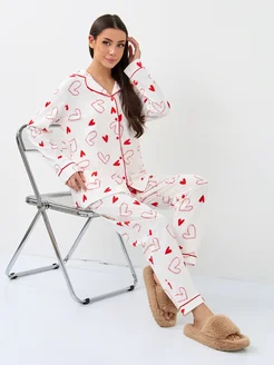 Пижама женская со штанами и рубашкой с сердечками хлопок