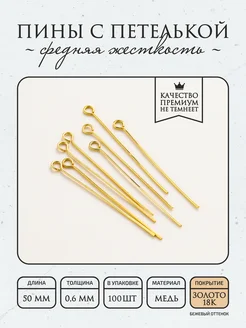 Пины 50 мм с петелькой 100 шт, гальваническое покрытие 18К