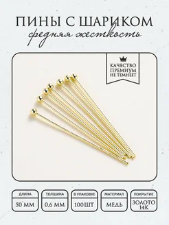 Пины 50 мм с шариком 100 шт, гальваническое покрытие 14К