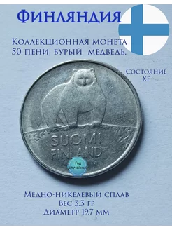 Финляндия, монета 50 пени. Бурый медведь. XF