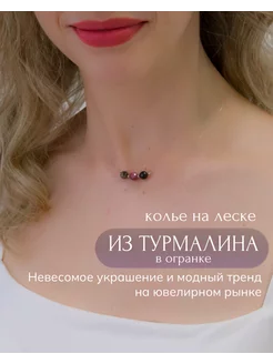 Колье на шее из турмалина в огранке, подвеска на леске