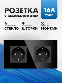 Розетка черная двойная со стеклянной рамкой и заземлением