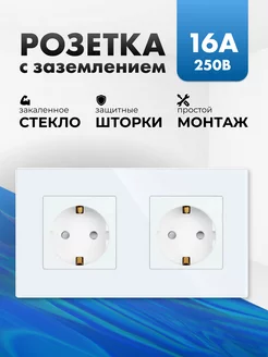 Розетка белая двойная со стеклянной рамкой и заземлением