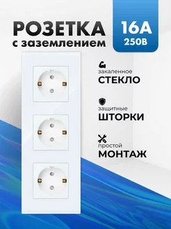 Розетка белая тройная со стеклянной рамкой и заземлением
