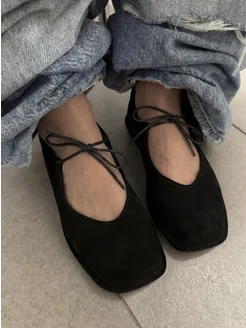 Балетки замшевые туфли с квадратным носом и бантиком