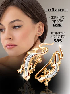 Серьги клаймберы серебро 925 позолоченные ящерица
