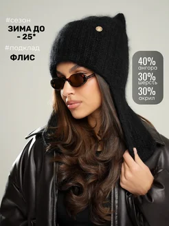 Шапка кошка зимняя с ушками ангора вязаная на флисе