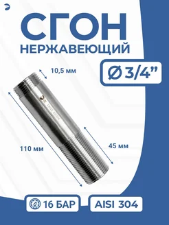 Сгон нержа, 3 4" дюйма двойной ниппель ДУ 20