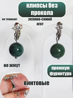 Клипсы на уши женские без прокола, агат зеленый