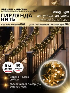 Гирлянда светодиодная уличная Нить 5м теплый белый мерцание