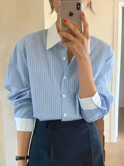 Рубашка в полоску голубая с белыми манжетами и воротником