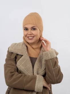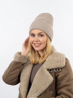 Шапка мериносовая с вывязанной макушкой. Кэмел