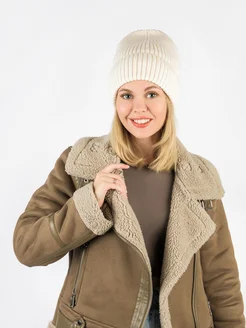 Шапка мериносовая с вывязанной макушкой. Молочная