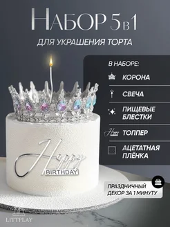 Корона на торт с топпером серебро набор свеча и блестки