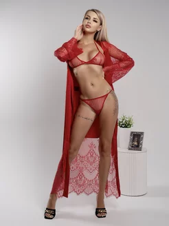 Пеньюар кружевной сорочка комплект со стрингами прозрачный
