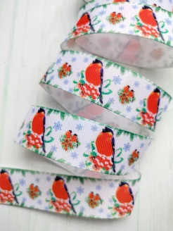 Репсовая лента с рис. "Снегири" шириной 25 мм 5 м