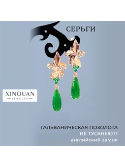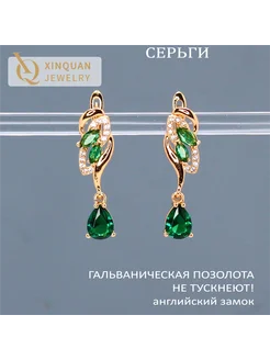 Серьги EMERALD с иск. изумрудами, 30х8 мм, позолота