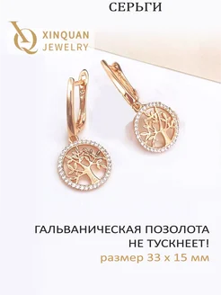 Серьги Древо Жизни с фианитами, 33х15 мм, позолота