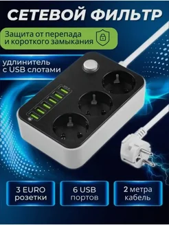Cетевой фильтр удлинитель 3 розетки 6 USB