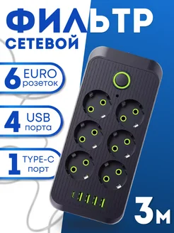 Удлинитель сетевой фильтр 6 розеток, 4 USB, 1 Type-c 2500W