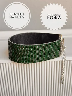Браслет на ногу натуральная кожа и стразы изумрудно-зеленый