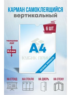 Карман самоклеящийся ''А4 ПЭТ 0,5 вертикальный'' 6 шт
