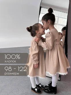 Платье для девочки бежевое с длинным рукавом с кружевом