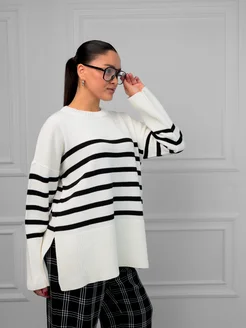 Свитер белый вязаный оверсайз с принтом в полоску весенний