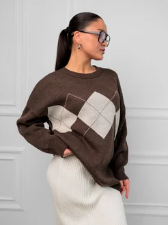 Свитер хаки вязаный новогодний оверсайз с принтом
