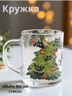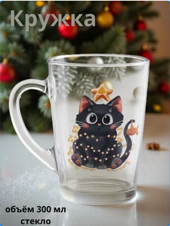 Кружка для чая кофе новогодняя стеклянная 300 мл, котик