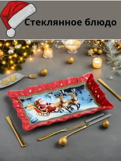 Блюдо новогоднее Дед Мороз, стеклянное прямоугольное