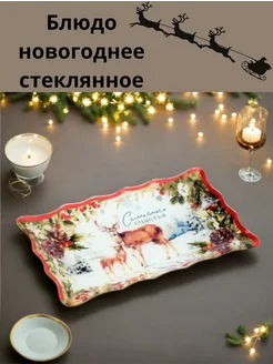 Блюдо новогоднее олени, прямоугольное стеклянное
