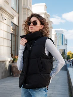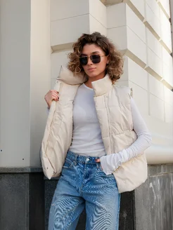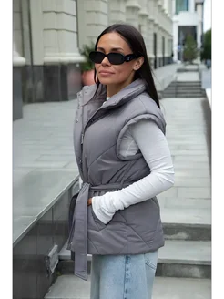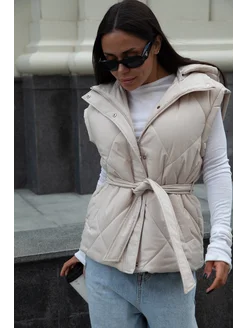 Жилетка оверсайз утепленная на поясе с капюшоном