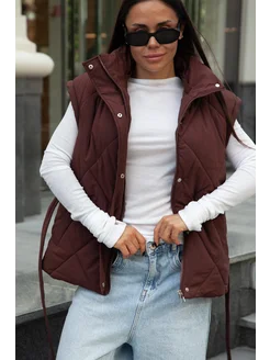 Жилетка утепленная на поясе с капюшоном стеганая осенняя