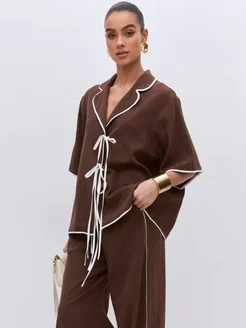 Льняной летний брючный костюм с рубашкой оверсайз