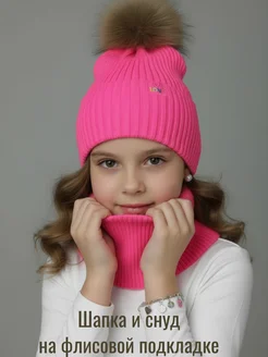 Шапка и снуд зимняя для девочки с пушистым бубоном