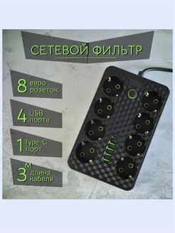 Сетевой фильтр с USB и Type-C, 8 розеток 3 метра