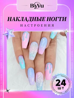 Накладные ногти с дизайном и клеем длинные