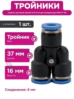 Тройник цанговый прямой соединительный 6 мм для компрессора