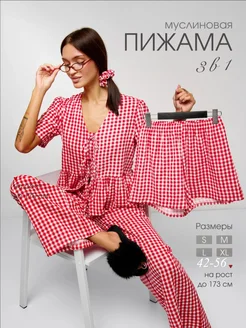 Муслиновая пижама с рубашкой шортами и со штанами в клетку