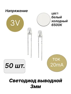 Светодиод выводной 3В 3мм белый холодный 6500К
