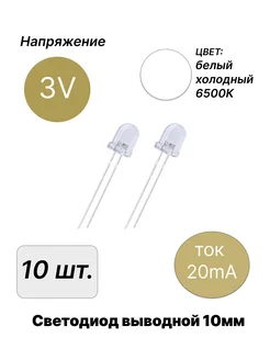 Светодиод выводной 3В 10мм белый холодный 6500К