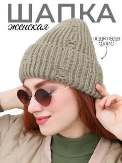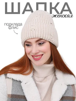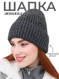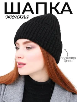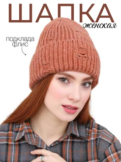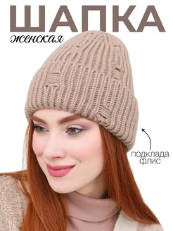 Шапка женская зимняя вязаная бини на флисе с отворотом