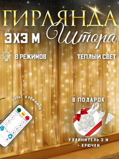 Гирлянда штора 3х3 м теплый белый (желтый) с пультом