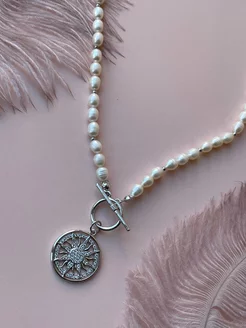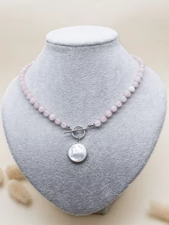 6109 Колье натуральный розовый кварц подвеска перламутр круг