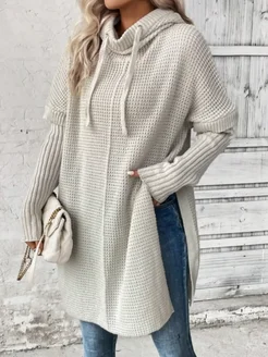 Свитер оверсайз с разрезами удлиненный с капюшоном