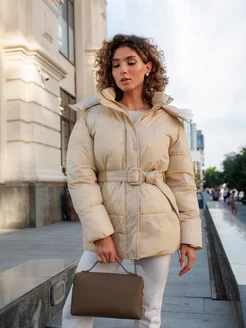 Куртка на поясе с капюшоном демисезонная пуховик теплый