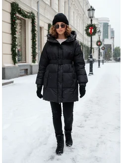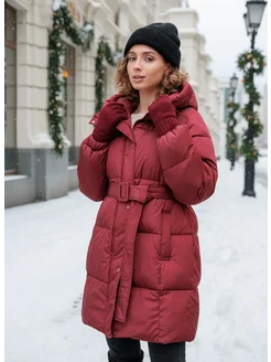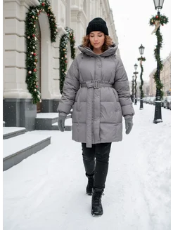 Куртка зимняя на поясе длинная пуховик с капюшоном