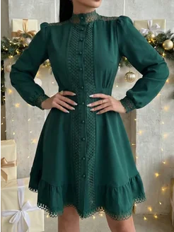 Вельветовое платье ниже колен с кружевом и пуговицами