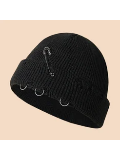 Черная вязаная шапка с металлическими кольцами и скрепкой